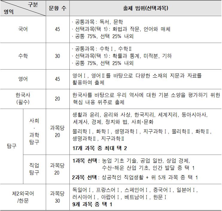 국어, 수학, 영어, 한국사, 탐구(사회, 과학, 직업), 제2외국어/한문으로 구성이 돼요~