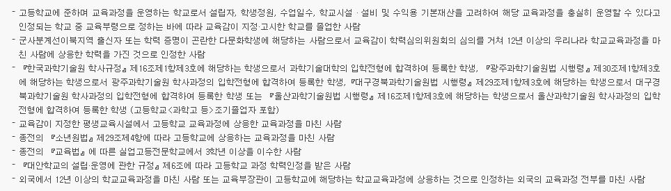- 초, 중등교육법 시행령 제98조의 규정에 의거 고등학교를 졸업한 사람과 동등한 학력이 있다고 인정된 사람 중