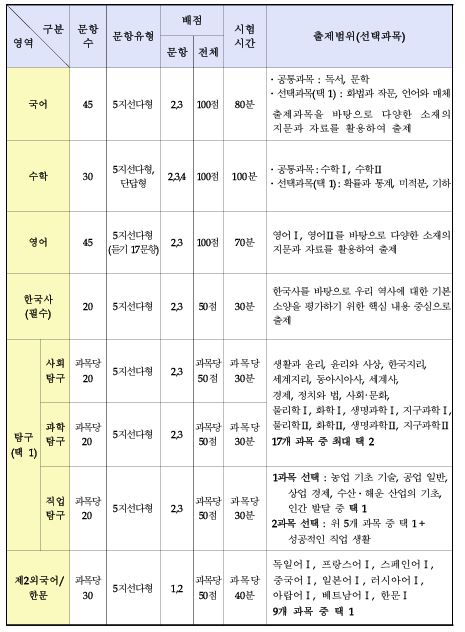 (국어, 수학 공통+선택 과목 구조, 제2외국어/한문 절대평가) 동일 적용돼요