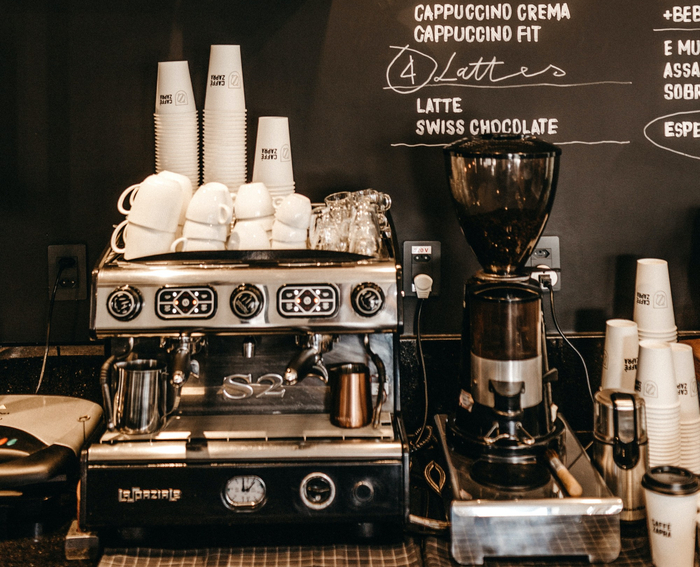 Espresso + steamed milk + dark chocolate powder or chocolate syrup