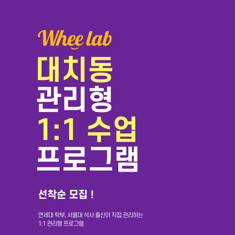 휘랩연구소 클래스 • 2022. 4. 13. 21:57 [대치/강남] <1:1 소수정예 휘랩 관리형 독서실형 자습실&공부방>(독학재수, 순공10시간) 네이버 블로그에서 보기 신청 및 문의는 아래 링크를 통해 작성부탁드립니다^^ 이전 글 내 MBTI는 어떤 줄임말일까? EI/NS/FT/PJ 영어 발음방법&의미❤ 다음 글 2023 입시 수능최저학력기준 변경, 수시 논술전형 중요내용 3분컷! 목록으로 돌아가기