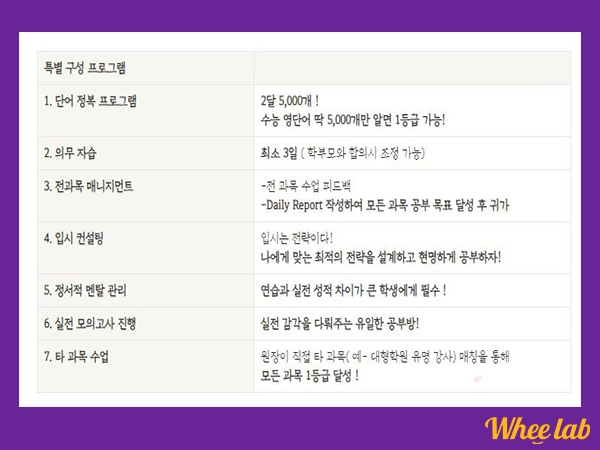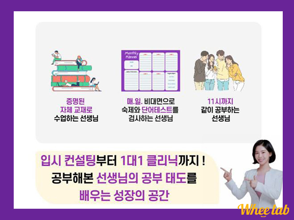 밤 11시까지 운영하면서 소수 정예로 운영되어 자습실이 별도 마련되어 있고