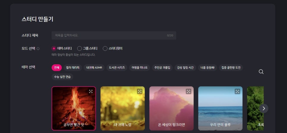 그리고 웨일온 스터디를 통해서 주인공 과몰입 테마를 선택해서