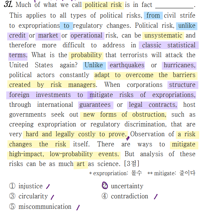 쉽게 나왔을 때는 빈칸에 관련된 근거 반복을 2번