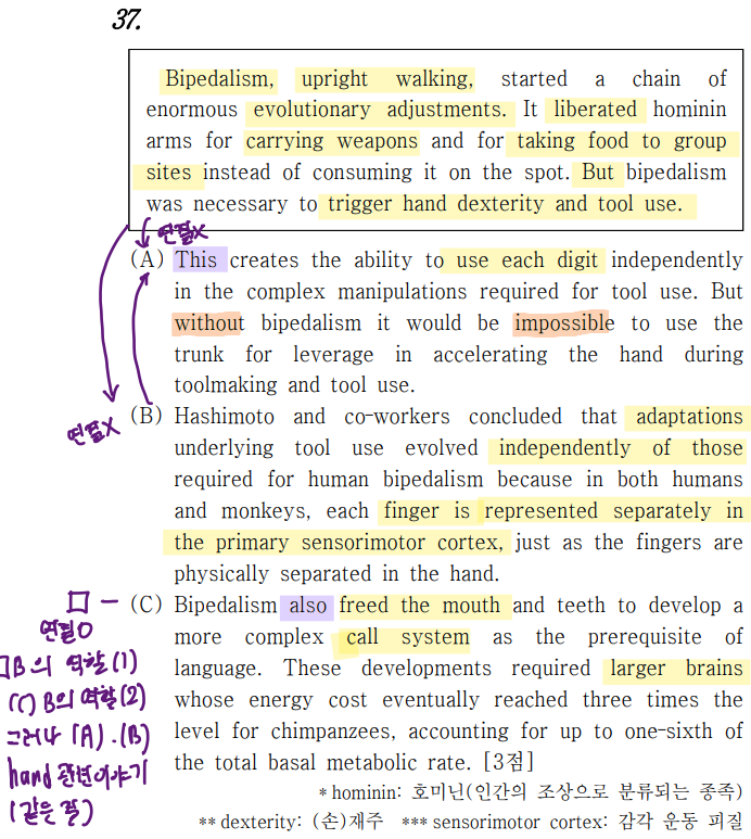 네모칸- (C) 불가능하다 (B) 첫째줄을 읽었다면, 손재주/도구사용에 관련된 내용이 다 설명되고 나서야 다른 요소(입/이) 다른 결을 묶을 수 있다. *같은 결끼리 묶는다 원칙 |