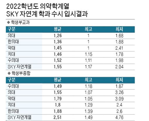 2022학년도 SKY 자연계 학과 수시 입시 결과