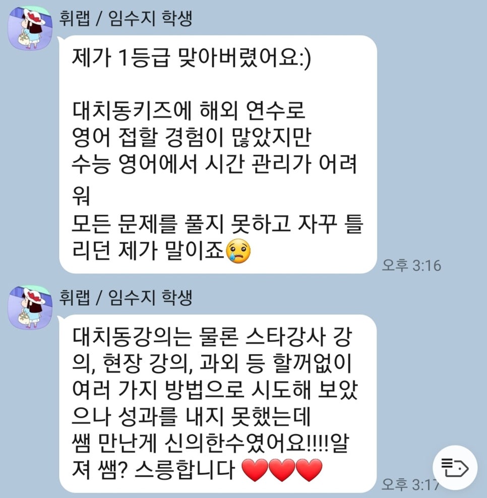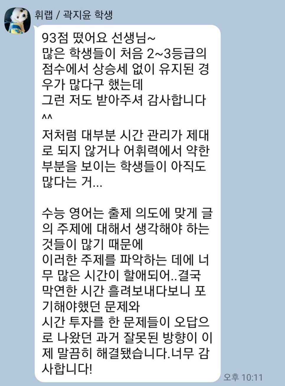 수업을 진행하는 요일 이외에도 카카오톡을 통한 실시간 학습 점검과 관리를 진행하고 있어