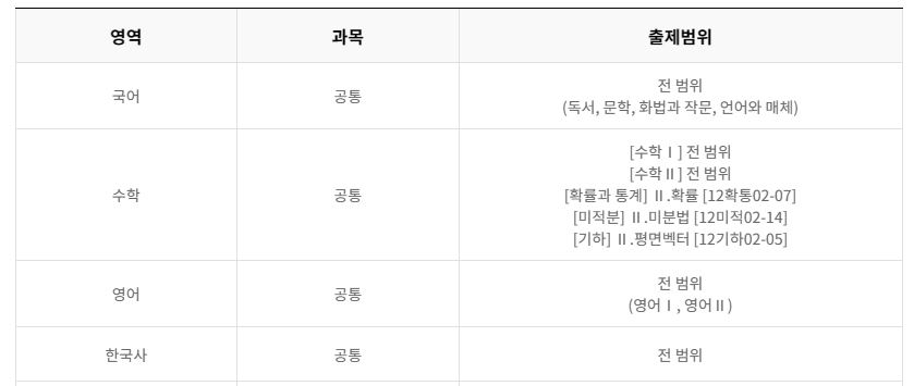 공통과목은 국어, 영어, 수학 1, 수학 2는 모두 전범위가 출제가 되기 때문에