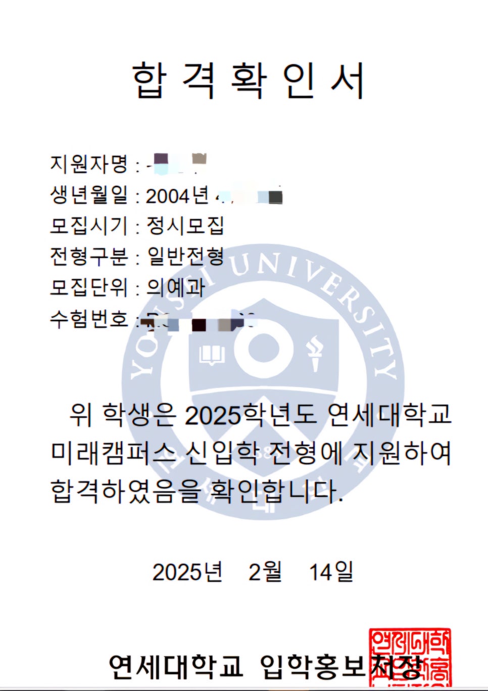 목표 지원 대학, 학과인 연세대 의예과 정시 합격으로 성공적인 합격을 했습니다.